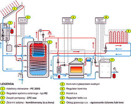 kominek z płaszczem, instalacja solarna i piec gazowy